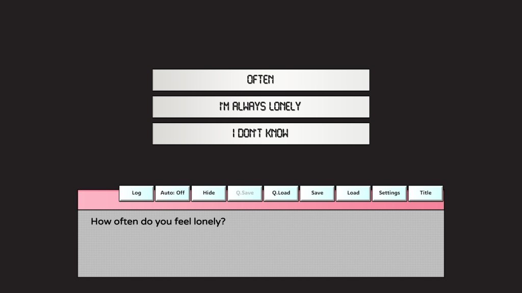 After an entertaining intro section with jovial tune accompanying close ups of your counterparts, the game proper then opens with some questions about your loneliness.