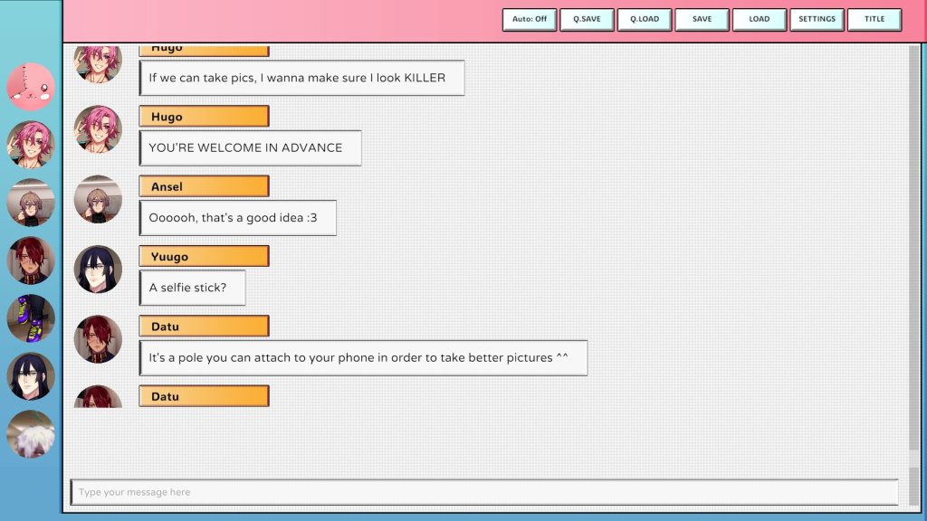 Although the game is strictly “female gaze”, any guys curious about this should not be put off – so long as you have an open mind – as the fun and amusement levels within the group chats serve as plenty reason enough for you to take a punt also. Writing quality in bringing out several different personalities is excellent, and typing accuracy is well over 99.9% – I spotted a couple of misplaced apostrophes and one single letter typo in the entire text.
