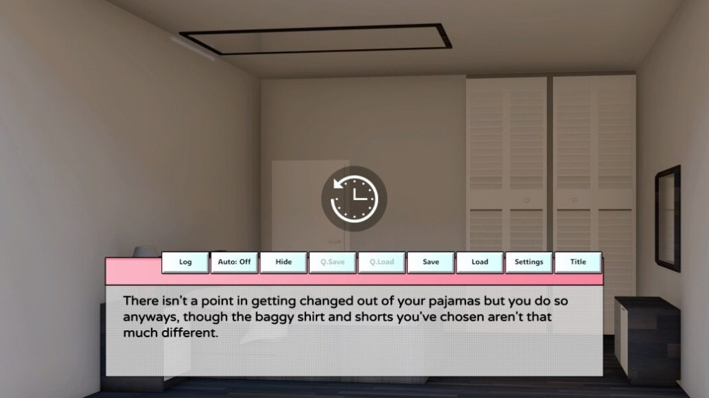 The other one, as demonstrated in the screenshot below, is totally avoidable without affecting your user experience. I stumbled across it by thoroughly testing for review purposes. If you go into the history log, many entries have a little timer icon to their immediate left. I wondered if this was a rollback feature (as there is no back option for the motel room sequences) when I discovered that this icon is clickable. The result was that the game did, indeed, go back to the caption relating to the icon I clicked, but story progress froze at that point with the timer present in the middle of the screen: