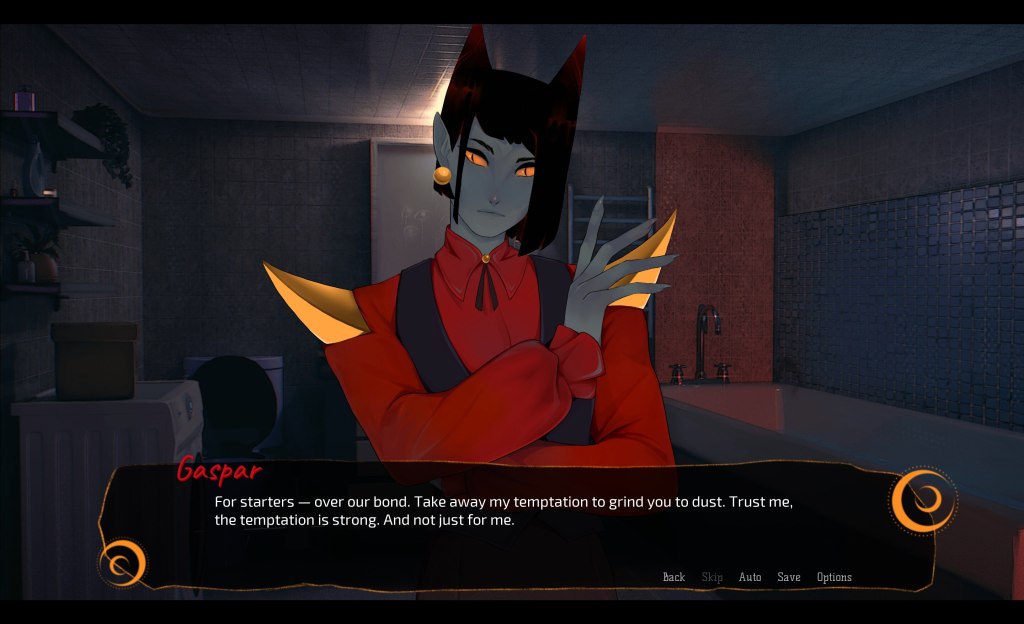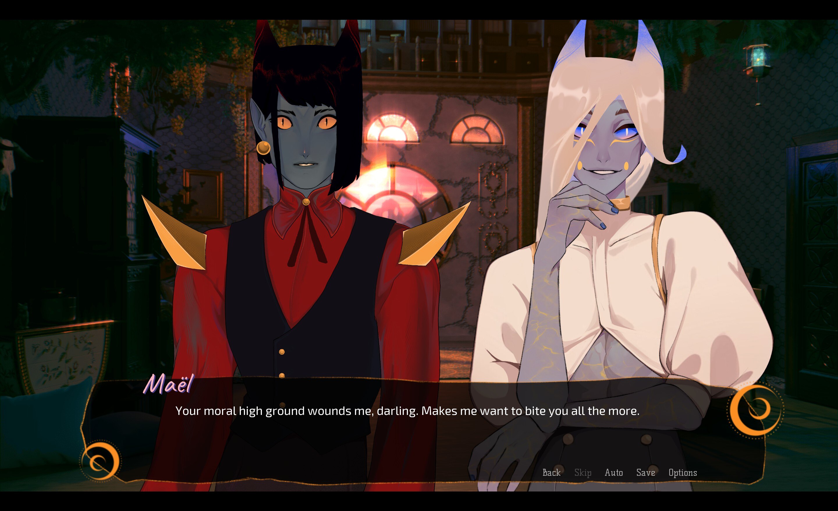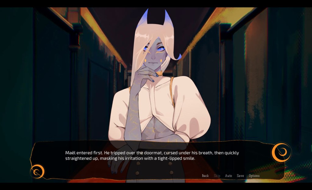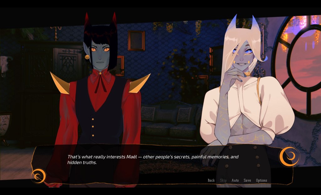 Mael is very much the play loose and have fun, kind of guy. He is all for showing their world to Veronica and letting her do things the way she wants to. He is also a very suggestive guy. Because he is the way he is, he has no problem digging into Veronica’s secrets, which is very much the opposite of Gaspar. While Gaspar knows of Veronica’s secrets, thoughts, and past, because of their bond, he does not bring them up with her unless she touches the topic first. Mael does not have this kind of sensitivity and will just nonchalantly bring things up, even if the topic is traumatic. Mael even has this line “Old Blood [Gaspar] respects your secrets, while I prefer to study them. And cut them open if they start to fester.”