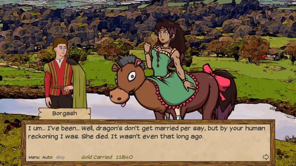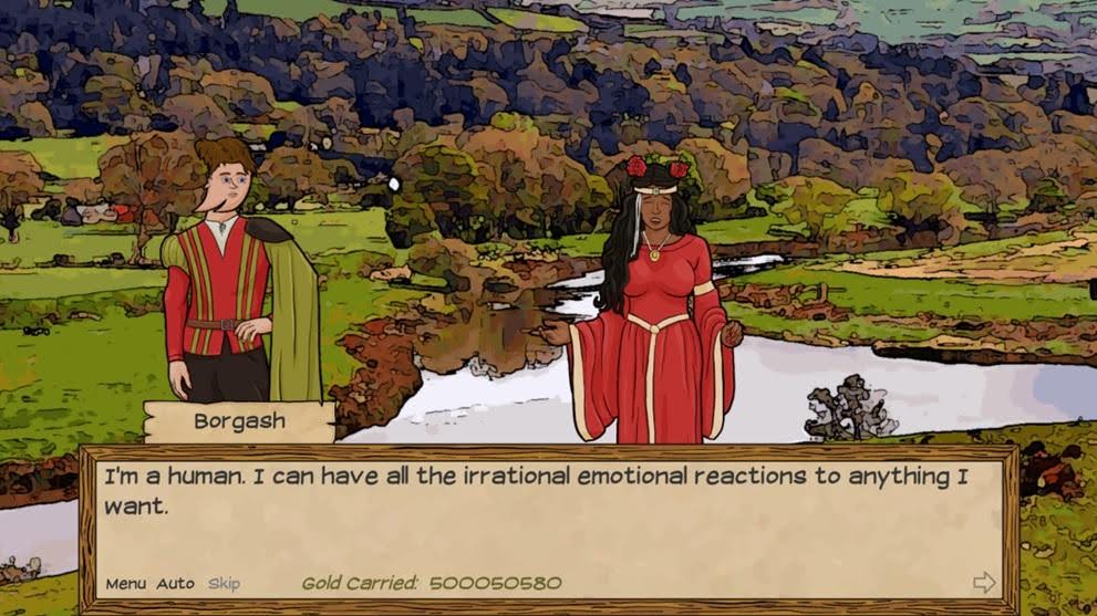 When the necessity for Borgash to take human form arrives, the player is presented with options for a head shape. Choosing one of the “incorrect” ones leads to some hilarious lines, as does choosing the noble lady as a date. I had a spell of several minutes having to wipe away tears of laughter.