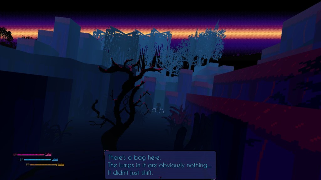 In terms of a plot, you aren’t going to get much here. What I found captivating was the setting and characters. The two go hand-in-hand since the setting is defined by the individuals (called Shapes) living in it and vice-versa. As an example from the first Digression, dark and twisted forest would not be nearly so significant if it didn’t have Shapes such as the giant creatures stomping in the background, humanoid shapes that can only mimic the words of past visitors, and gruesome meat houses with inflatable men trying to lure Glad within. The Shapes on their own, however, would not be quite so chilling if they lacked this environment. Bloody rivers that block Glad’s path, crystalline trees that cut through them if brushed the wrong way, and abandoned bags with something incredibly wrong lurking within are all unsettling compliments to the alien lifeforms within. It is from these pieces that a story can be formed. What fate did those mimicked individuals suffer? Where did these bizarre bags come from? Why did a Timeless Chorus get immortalized in a lake? I loved finding bits of lore that confirmed certain theories while leaving the rest to my imagination.