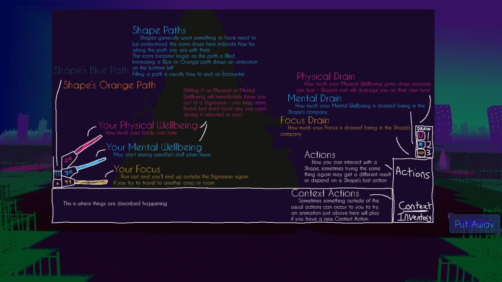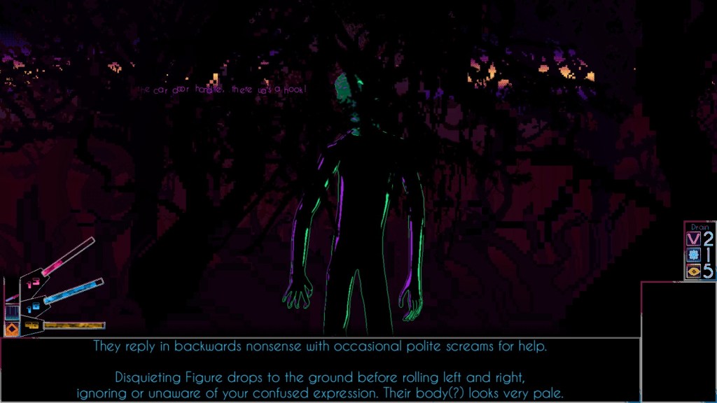 At an initial glance, FriendShapes seems to have been made solely with pixel art. That is quickly proven wrong upon entering Encounters with the Shapes. Each Shape has sprites on the map, but they have full drawings in the Encounters. These drawings add to the sense of wrongness with this world’s inhabitants. Some of them also use contrasting art such as realistic eyes, blurry shadows, and 3D effects. It makes the Shapes feel distinct while also connecting them. The neon color schemes, curvature of the lines, and not-quite-right nature of the creatures made them really stand out to me. I can’t think of any other game I’ve played that’s used this kind of art style. Since I’m a fan of pixel art and I like the Shape designs a lot, the graphics helped enhance the experience for me. The Shape designs have clever elements to them that I can’t get into without spoiling elements of the game, but I’ll note that Pursuant has my favorite design. Once you know the story behind that Shape, its appearance is both brilliant and heart-wrenching.