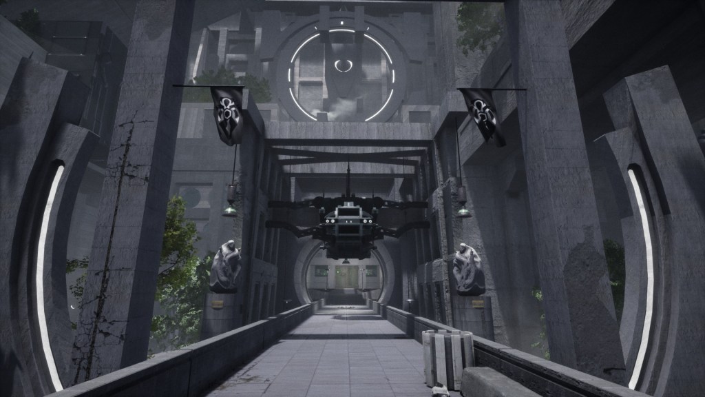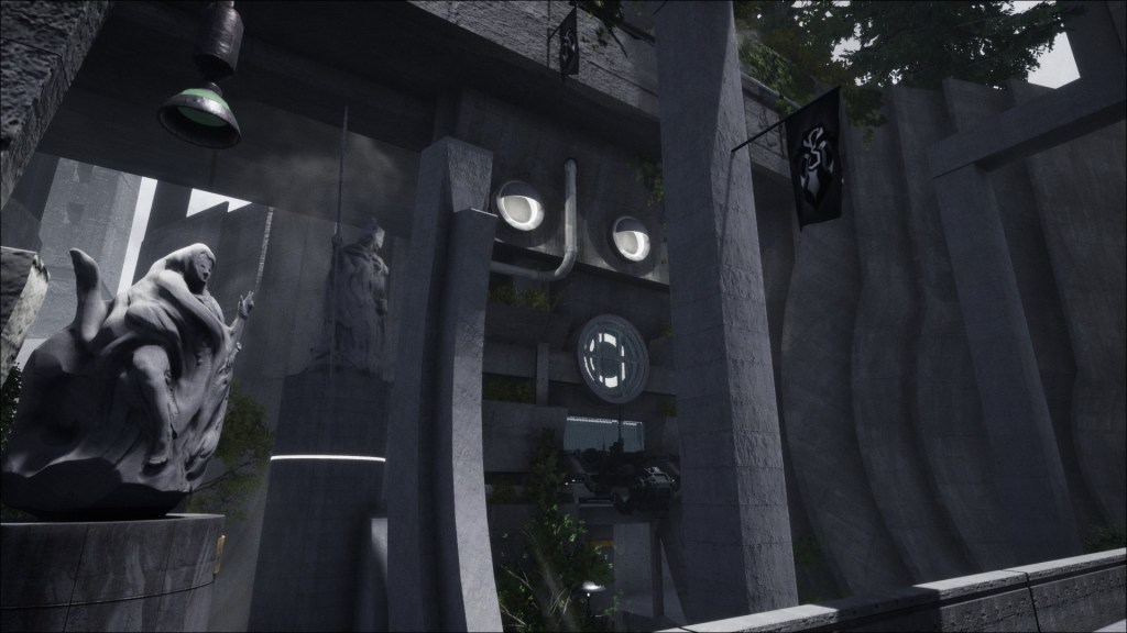 The graphics are the strongest part of A Doctor’s Term. Most futuristic settings involve a lot of metal, glass, and machinery for their environments. This game does have some of that, but for the most part the setting has a heavy focus on stone. The building Dr Batten works in looks stunning. The towering humanoid statues, plant-encroached bridge, and proudly displayed banners are striking for their uniqueness in such a time period. The sheer emptiness of such large locations gives it an atmosphere of uneasiness to go with the awe. Environmental storytelling is a big part of walking simulators, and A Doctor’s Term does a great job with it.