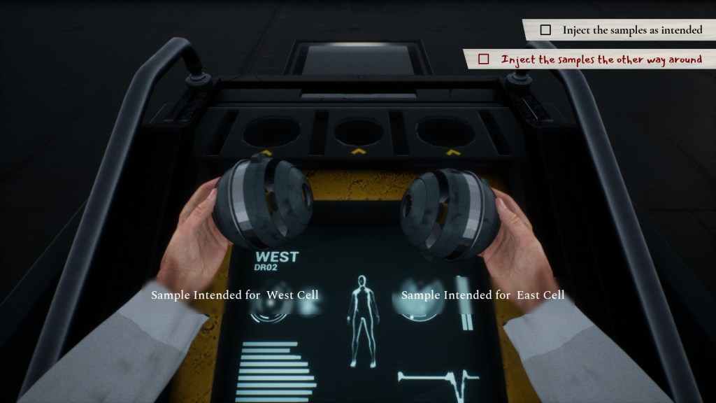 Related to that, you don’t do much as a doctor. I’m not even sure why Dr Batten needs any credentials. The job is literally taking capsules a machine gives you and putting them where said machine tells you to. This is followed by the machine telling you if the capsules shouldn’t be used with the patients and having you recycle the capsules. I don’t mind this as a simplistic gameplay mechanic. It just feels incredibly silly from a story perspective. A trained monkey could do this job about as well as Dr Batten does. Even funnier is that he only does one of these a day, meaning his work shifts are about five minutes long. Must be nice to get paid for that.