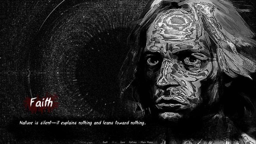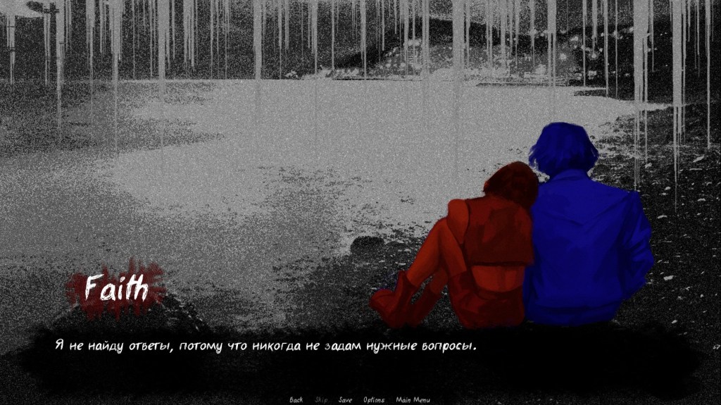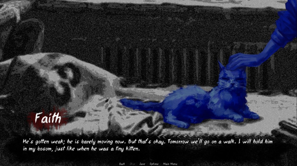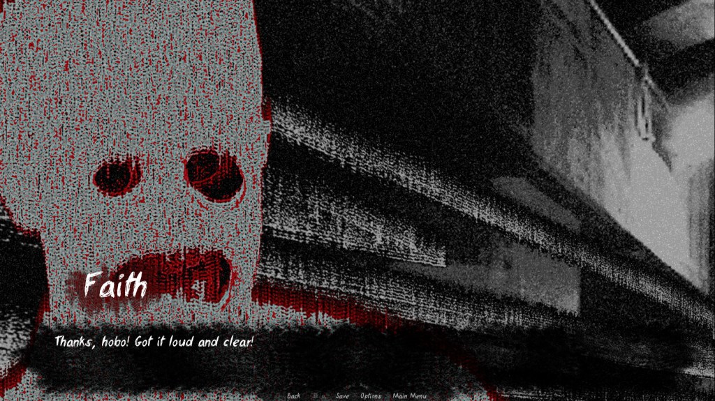 There are some sections where you have to click on a part of whatever background is present to move the story along. The first example of this opens the game, as you have to click “Stand up” to proceed. I assume these are in the game to showcase the actions Faith is taking, as it would be odd for him to say his movements out loud. Since there is no omniscient narrator, this works. I’m noting it more because it stood out to me and was different from other visual novels I’ve played.