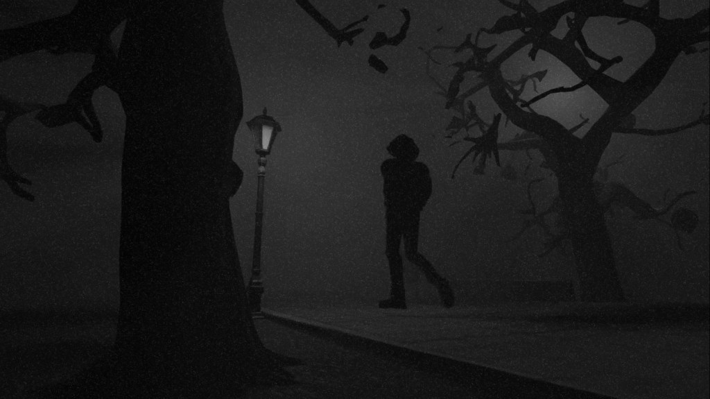 A much stranger choice was the use of 3D segments. Occasionally the game would show Faith walking from one location to another in 3D. I’m not sure why these segments exist. They’re certainly interesting in appearance, foregoing any other color for purely gray tones and having Faith as a dark figure without features. There doesn’t seem to be much purpose though, unless I’m missing some kind of symbolism from these short sections.