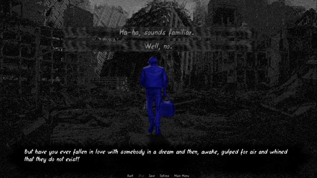 This is the main reason to play Lost Infinity. Its art style gives an atmosphere to this visual novel that I doubt it could otherwise capture. The two main human portraits are drawn in a realistic way, though not so much that they would be mistaken for photographs. In contrast to the clearly portrayed humans, the backgrounds are deliberately fuzzy, using light static to give them a feeling of separation. There are sections that use surreal imagery, and these tended to leave me with a mixture of disturbance and fascination. It’s very difficult to explain how well this works for the setting without showing the art itself. I have included some images in the website version of this review; hopefully that helps.